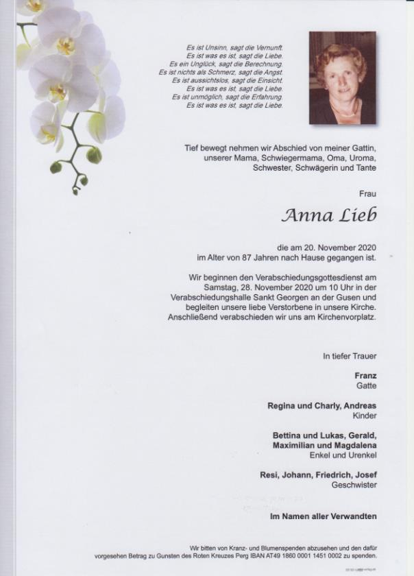 Liebe Familie Lieb, wir möchten euch unser Mitgefühl aussprechen. Tante Anna war ein so humorvoller und lieber Mensch, wir werden uns immer gerne an sie erinnern. Alles Liebe von Gerlinde und Richard