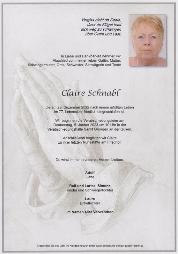 Traueranzeige Claire Schnablverstorben 23. Dezember 2022 Verabschiedung 05. Jänner 2023 10 Uhr in der Verabschiedungshalle Traueranzeige Claire Schnablverstorben 23. Dezember 2022 ← zurück zu den Traueranzeigen