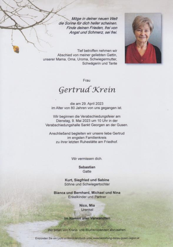 Liebe Familie Krein. Wir wünschen für den schmerzvollen Verlust, viel Kraft uns Zuversicht für die Zukunft. Frau Krein wird uns als liebe Nachbarin und Freundin meiner Mutter sehr fehlen. Liebe Traudi ruhe in Frieden Ahrer Maria, Edi & Evi