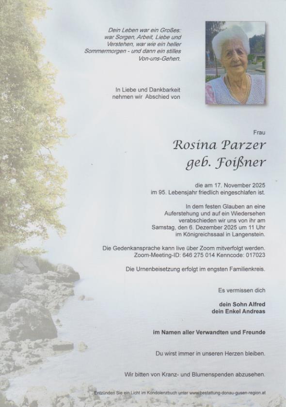 Traueranzeige Rosina Parzerverstorben am 17. November 2025 Verabschiedung am 6. Dezember 2025 um 11 Uhr im Königreichssaal in Langenstein Traueranzeige Rosina Parzerverstorben am 17. November 2025 ← zurück zu den Traueranzeigen